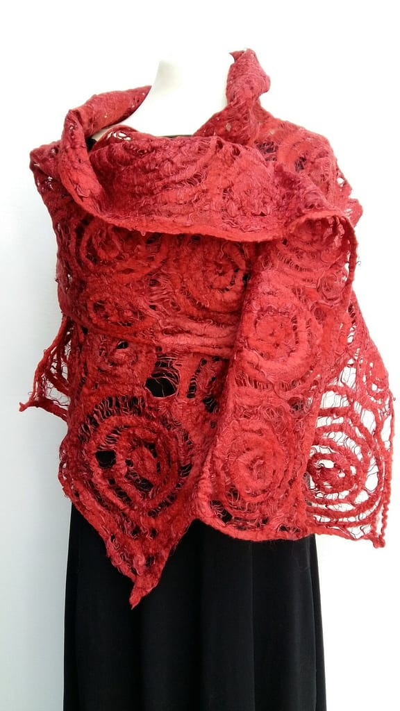 For the last couple of years I’ve focused on nuno felting, a technique developed around 1992 by Polly Stirling, a fiber artist based in New South Wales, Australia. The name stems from the Japanese word nuno, meaning fabric. This technique consists of binding loose fibers, usually wool, to a pure fabric like silk gauze, creating a lightweight felt. I apply nuno felting to fine merino wool and chiffon silk to create my scarves. Depending on how inspiration strikes me, I incorporate other materials as well such as silk string, lace, fibers of all sorts and other kinds of wool like mohair, wensleydale, …